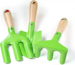 Každý kúsok je navrhnutý pre malé ruky: hladké drevené rukoväte príjemne padnú do dlane, kovové časti sú odolné a látkové rukavice chránia pri práci. Set je skvelý na hru na záhrade aj v pieskovisku a vďaka skladnému baleniu je všetko vždy po ruke.
