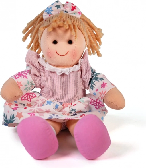 Jemné textílie a priadzové vlasy lákajú k mojkaniu, zatiaľ čo farebné šatočky so vzorom hviezdičiek podporujú vnímanie farieb a rozvoj fantázie. Hra s bábikou rozvíja jemnú motoriku, sociálne zručnosti a schopnosť starať sa a pomáhať.