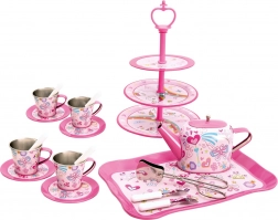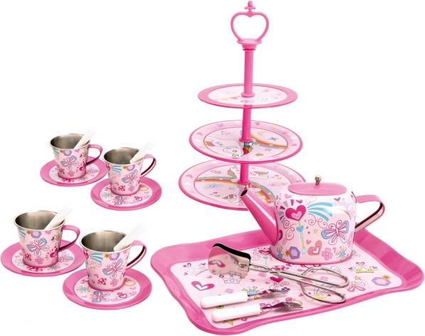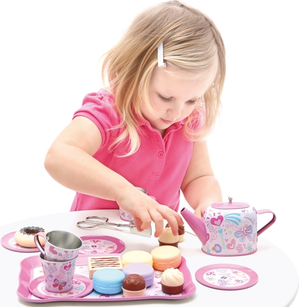 Čas na kúzelný čajový večierok! Tento bohatý čajový set pre deti ponúka všetko pre zábavné stolovanie s rodičmi, bábikami aj plyšákmi. Sada je detailne dekorovaná, vyrobená z odolného ľahkého kovu a nezávadného plastu, podporuje fantáziu, spoluprácu a komunikačné zručnosti. Obsahuje servis pre 4 osoby a celkom 35 dielov, vrátane poschodového stojana na sladkosti.