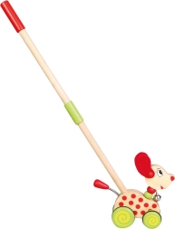 Drevený jazdiaci psík na tyči od značky Bino je obľúbená pohybová hračka, ktorá motivuje deti k chôdzi a aktívnemu pohybu. Pri tlačení pred sebou psík so zvončekom jemne cinká, čo deti baví a podnecuje k ďalším krôčikom. Pogumované kolieska zabezpečujú plynulý a tichý chod na rôznych povrchoch.