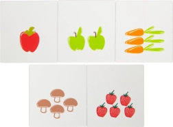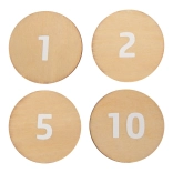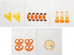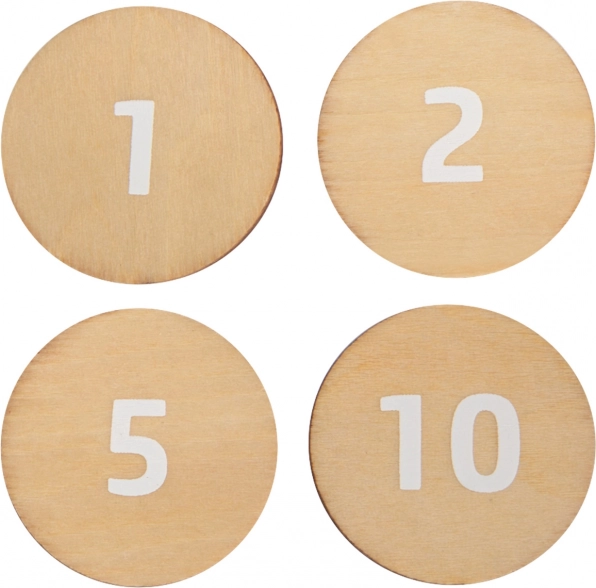 Obojstranné drevené mince a produktové karty pomáhajú deťom trénovať počítanie, rozpoznávanie hodnôt a základnú finančnú gramotnosť hravou formou.