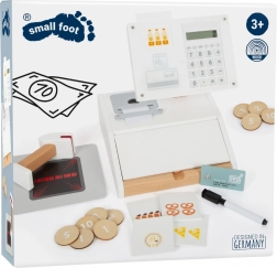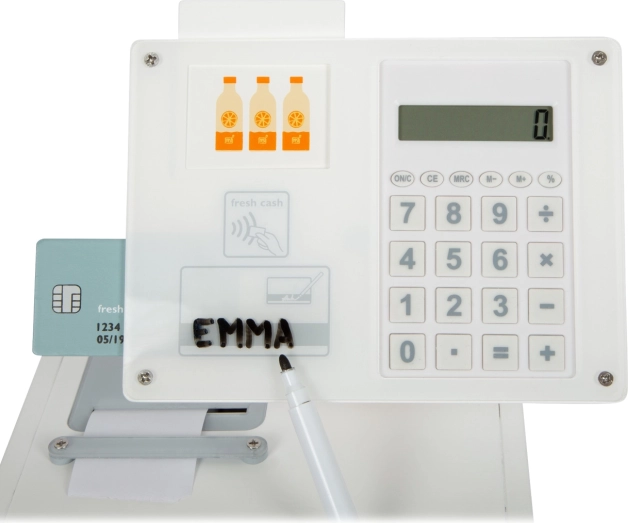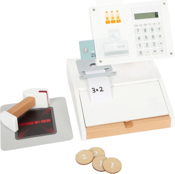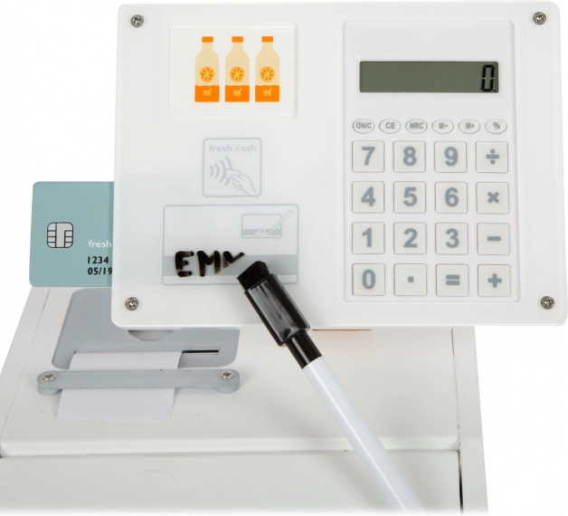 Drevená registračná pokladňa SMALL FOOT Fresh premení každý detský kútik na malý supermarket. Vďaka integrovanej kalkulačke v otočnom monitore deti ľahko spočítajú nákup, otvoria veľký šuplík s priehradkami na mince a vyskúšajú si bezhotovostnú platbu s vlastnou kartou a podpisom na plexiskle.