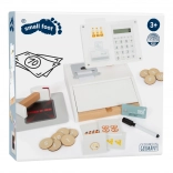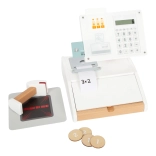 Súčasťou sú produktové kartičky, čítačka čiarových kódov, trhacia rola účteniek, skener a 15 obojstranných drevených mincí. Kombinácia dreva a plastu zaručuje odolnosť aj príjemný severský dizajn s priznanou kresbou dreva. Pokladňa podporuje učenie počítania, rozvoj fantázie a sociálnu interakciu pri hre na obchod.