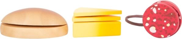 Táto kvalitná sada z robustného dreva prináša všetko, čo malí kuchári potrebujú: doštičku s možnosťou písania kriedou, bezpečný drevený nôž a bohatý výber potravín – paradajka, uhorka, mrkva, jablko, banán, syr, salám, maslo a pečivo. Jednotlivé diely držia pohromade pomocou suchého zipsu, takže ich deti môžu znova a znova „krájať“ a skladať.
