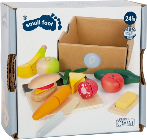 Farebné ovocie, zelenina, syr, salám aj pečivo sa vďaka suchému zipsu skvele krájajú a znovu spájajú – ideálne na nácvik správnej techniky krájania.