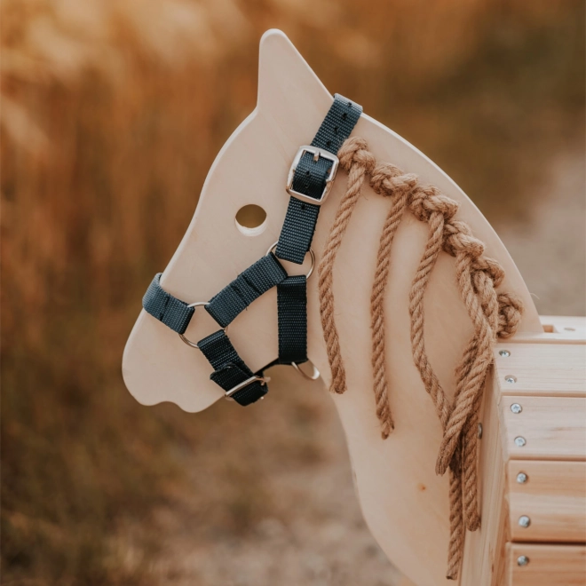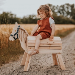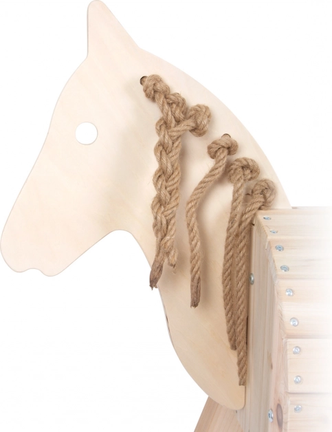 Detský drevený kôň je vyrobený z odolného neošetreného dreva, ktoré je možné podľa potreby ošetriť ochranným lakom. Výška chrbta koňa je 50 cm, čo umožňuje ľahký prístup aj menším deťom. Kôň stojí na stabilných nohách, vďaka čomu je bezpečný pri hre doma aj vonku. Súčasťou balenia je ohlávka, ku ktorej je možné pripojiť vodiace lano pre väčšiu interakciu pri hre. Drevený kôň podporuje rozvoj predstavivosti a jemnej motoriky detí vďaka sisalovej hrive a chvostu, ktoré môžu splietať a česať.