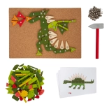 Sada obsahuje korkovú podložku, drevené kladivo, farebné dielce a pripínačky na tvorenie obrázkov.