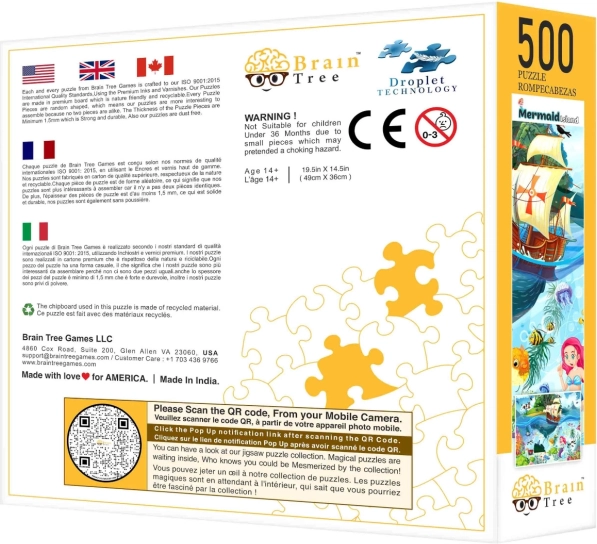 Užite si dobrodružné skladanie s puzzlom Brain Tree Morská Víla. Tento puzzle obsahuje 500 dielikov s unikátnym tvarom poskytujúcim rozmanitejší zážitok oproti tradičným puzzle. Matný povrch zaručuje viditeľnosť detailov za rôznych svetelných podmienok a vysoká odolnosť proti oderu zaisťuje trvanlivosť pri opakovanom skladaní.