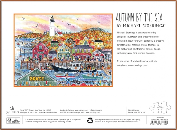 Vychutnajte si čaro pobrežného mestečka v prvých jesenných dňoch s umeleckým puzzle Jeseň pri mori od GALISON. Ilustrácia od Michaela Storringsa poteší hrejivými farbami a množstvom detailov, ktoré zaručia príjemnú výzvu. Kvalitný kartón z recyklovaných materiálov, matná povrchová úprava a nezávadná potlač prinášajú prémiový zážitok zo skladania. Rozmer zloženého obrázka je 69 × 51 cm, vhodné od 8 rokov.
