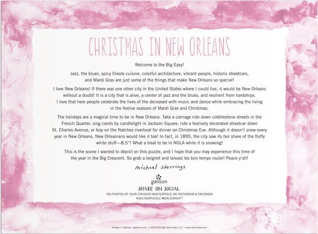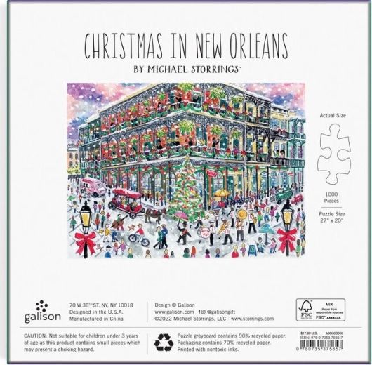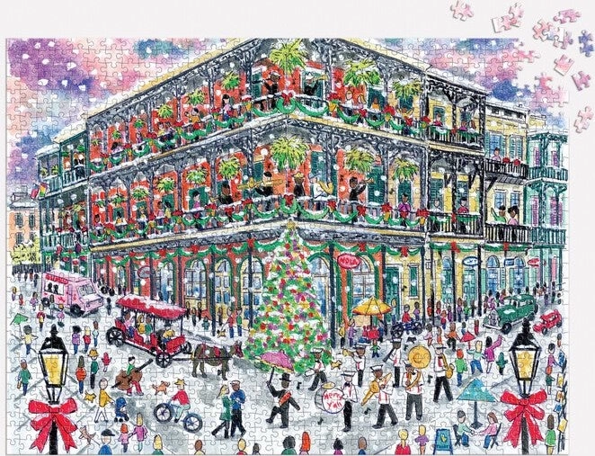Užite si čaro sviatkov s puzzle, ktoré prenáša atmosféru starej francúzskej štvrte v New Orleans. Ilustrácia od oceňovaného Michaela Storringsa žiari detailmi, ktoré vyniknú vďaka špičkovej tlači a matnej povrchovej úprave. Puzzle je vyrobené z recyklovaných materiálov a dodáva sa v pevnej FSC® krabičke.