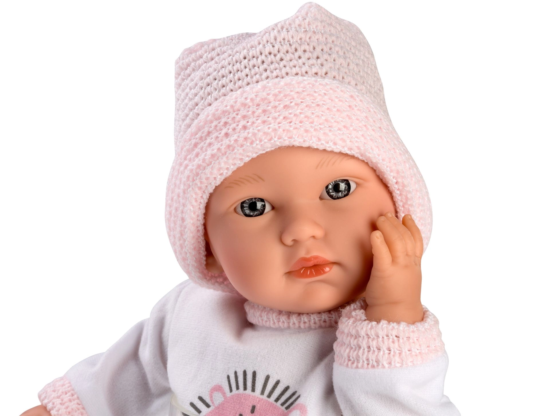 Po stlačení bruška bábika zaplače a zavolá „mama, tata“, čím podporuje empatickú hru a rozvoj sociálnych zručností. Oblečenie s roztomilou potlačou a pletená čiapočka sa ľahko obliekajú a vyzliekajú, čo rozvíja jemnú motoriku.