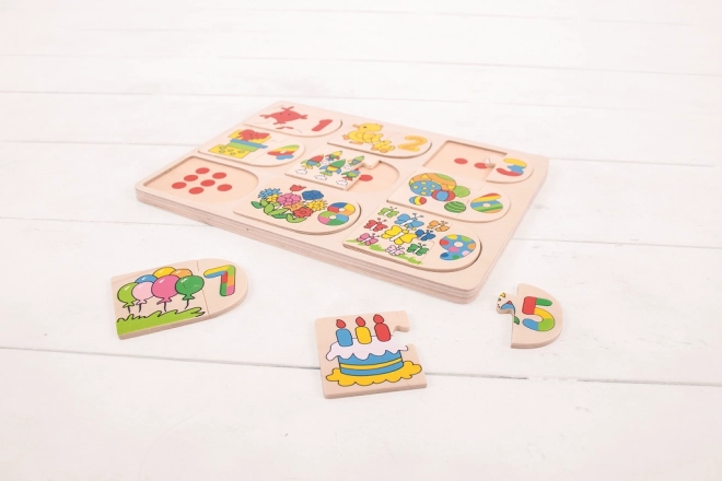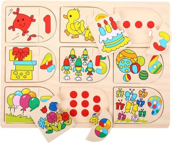 Vaši malí zvedavci si určite zamilujú toto malé, zaujímavé a chytré puzzle. Nielenže ich bude baviť triediť dieliky na správne miesta, ale môžu vkladať aj samotné obrázky a k nim potom priradiť tie správne čísla. Každý dielik drevenej skladačky je navrhnutý tak, aby uľahčil zdvíhanie a uchopenie v malej detskej ručičke. Puzzle sú potlačené obrázkami alebo farbami, ktoré napomáhajú procesu učenia a dodávajú vzdelávaciu hodnotu. Skvelý spôsob, ako rozvíjať obratnosť, rozpoznávanie tvarov, koncentráciu a počítanie už od útleho veku. Hlavné vlastnosti: vyrobené z vysokokvalitných materiálov zo zodpovedných zdrojov, spĺňa súčasné európske bezpečnostné normy.