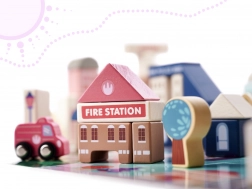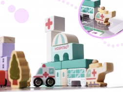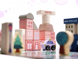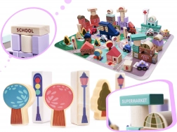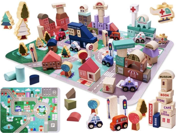 Bohato farebné drevené kocky predstavujú rôzne budovy a vozidlá, čo deťom umožňuje rozvíjať ich predstavivosť a jemnú motoriku.
