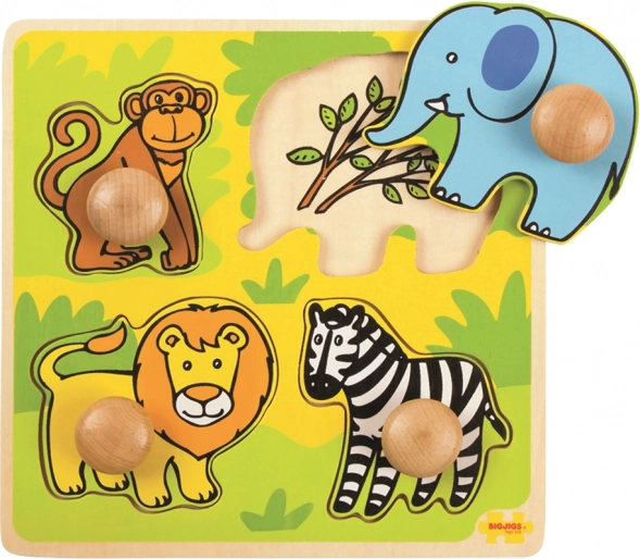 Prvé drevené vkladacie puzzle so zvieratkami zo safari od Bigjigs Toys poteší deti od 12+ mesiacov. Štyri robustné dieliky s úchytmi sa ľahko vkladajú a zábavným spôsobom rozvíjajú jemnú motoriku, koordináciu aj spoznávanie tvarov a farieb.