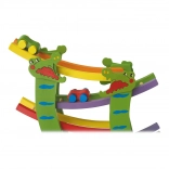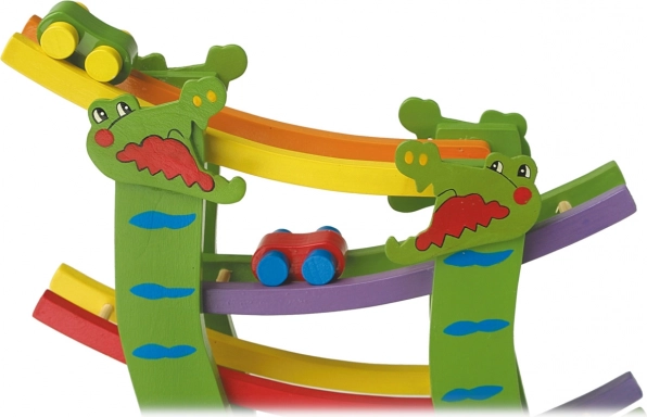 Táto drevená závodná dráha s krokodílmi premení detskú izbu na malý závodný okruh. Deti umiestnia autíčko na štart a sledujú, ako po jednotlivých poschodiach svižne kĺže až do cieľa. Pestré farby a veselý motív krokodílov lákajú k hre znova a znova.