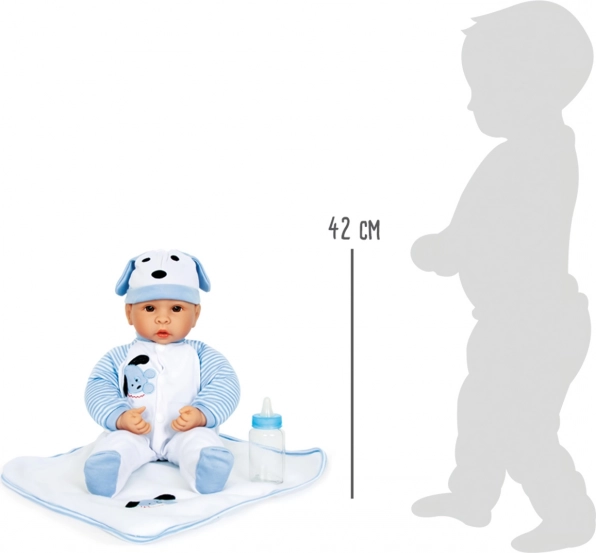 Bábika Beno je ideálny spoločník pre všetky deti, ktoré milujú psy. Táto realistická bábika je oblečená v roztomilom modro-bielom oblečení so šteniatkovým motívom a je dodávaná s dojčenskou fľaštičkou a cumlíkom.