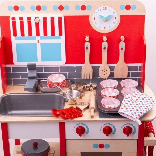 Táto komplexná sada na pečenie obsahuje všetko vybavenie, ktoré každý malý kuchár potrebuje pre svoje prvé pečenie. Vrátane plechu na pečenie, chnapky, formy na bochník, šľahacej metly, dreveného valčeka, misky, sady odmerných lyžíc a šiestich vykrajovačiek na pečivo.