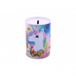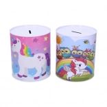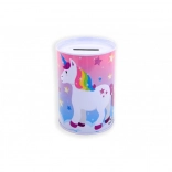 Pokladnička je zdobená veselými ilustráciami jednorožcov, ktoré pridajú hravý dotyk do každej detskej izby.