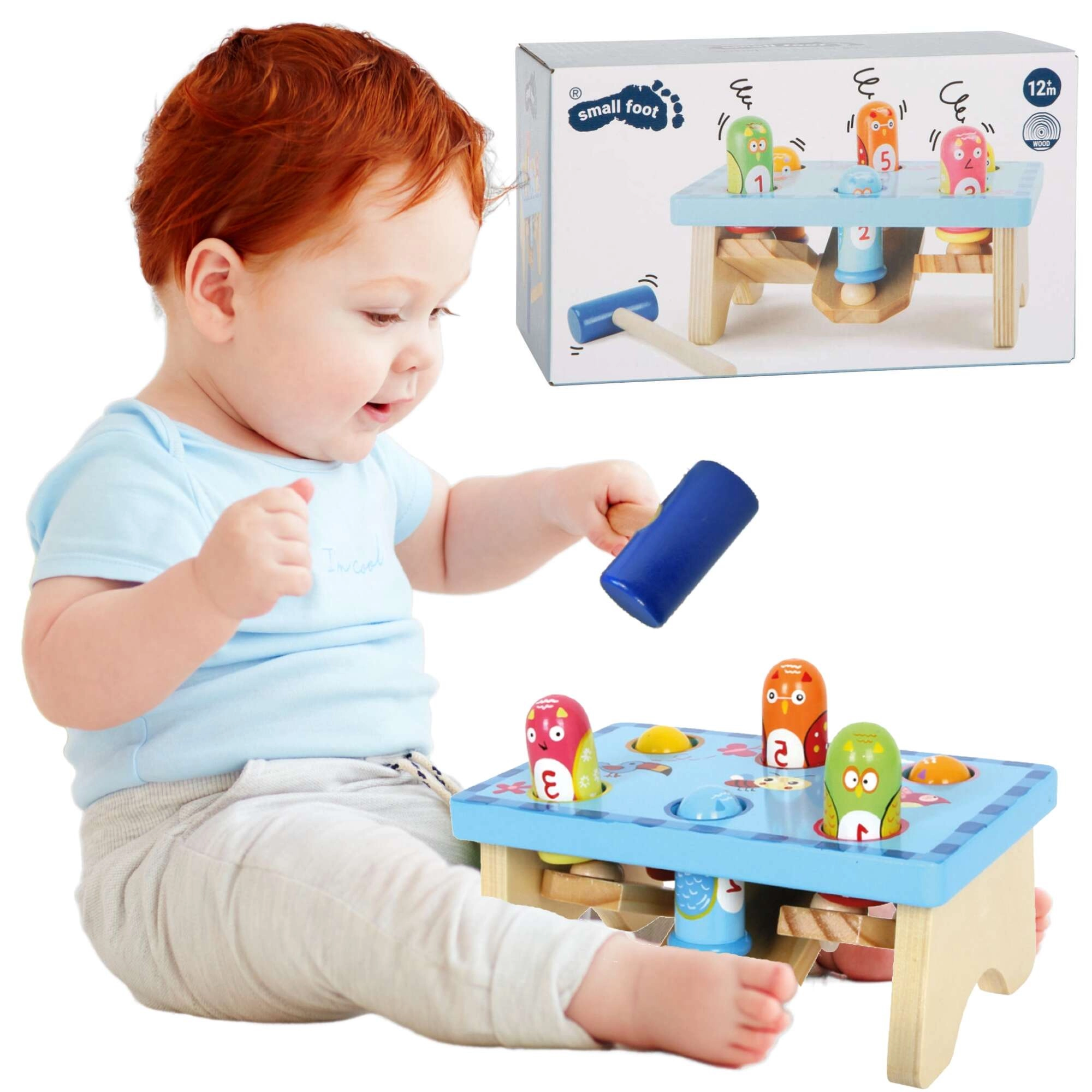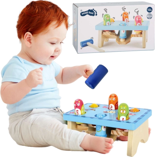 Zábavná drevená zatĺkacia lavica od značky Small Foot s motívom vtáčikov rozvíja detskú motoriku a sústredenie. Súčasťou je stabilná lavica v svetlomodrej farbe, farebné kolíky a drevené kladivko. Hračka podporuje koordináciu ruka–oko, presnosť úderu a učenie farieb a čísel, je vyrobená z kvalitného dreva a je vhodná pre deti od 18 mesiacov.