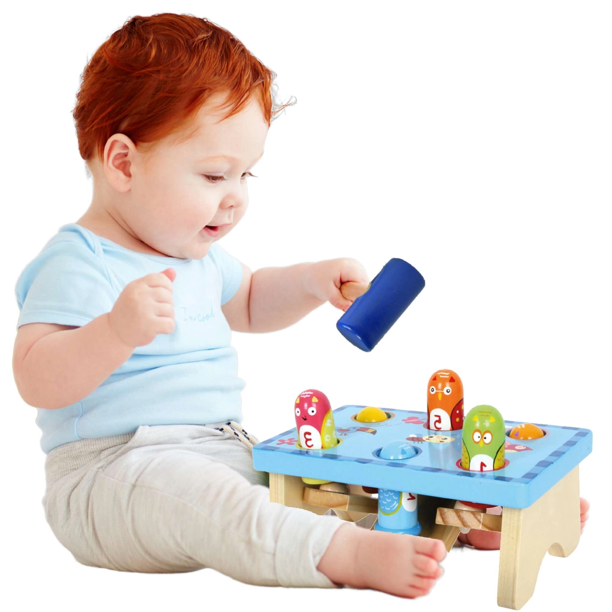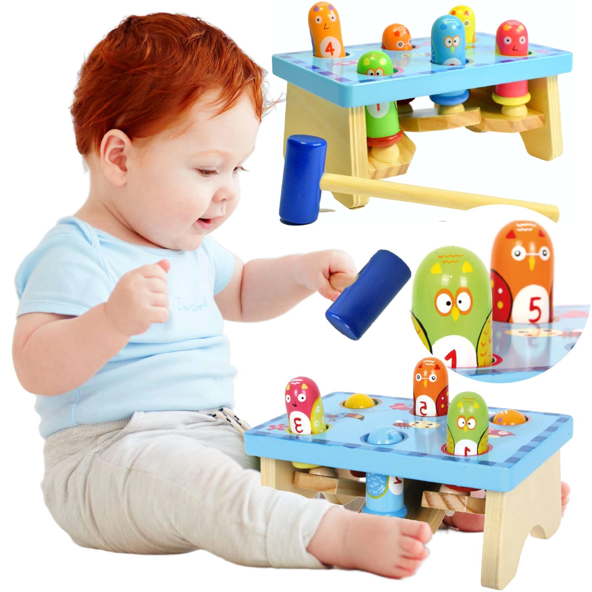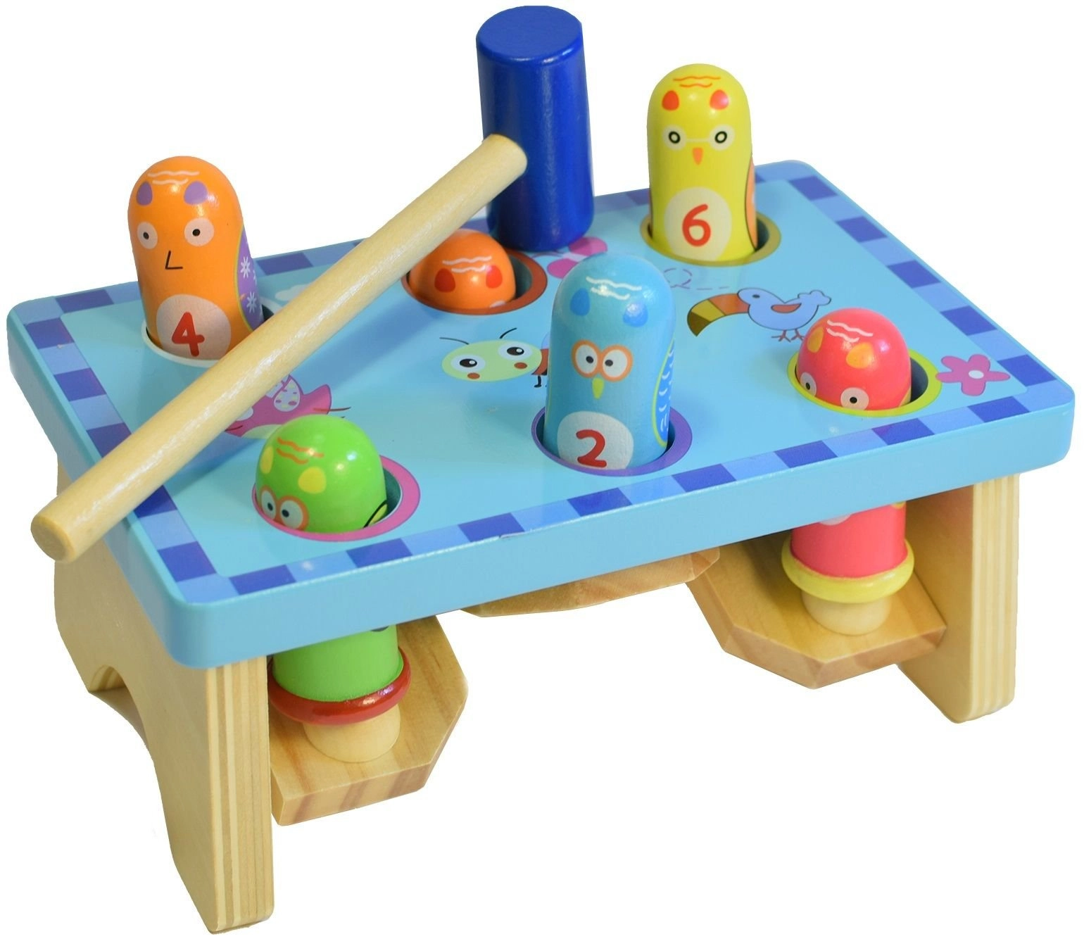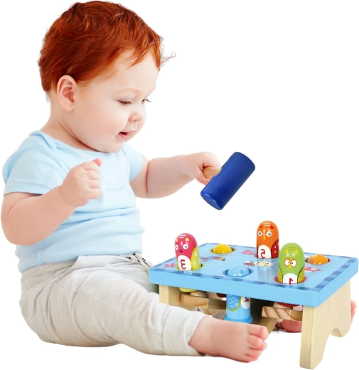 Vďaka pevnému spracovaniu a ergonomickému kladivku si deti precvičia jemnú motoriku, koordináciu pohybov aj trpezlivosť. Farebné a očíslované kolíky pomáhajú s rozpoznávaním farieb a počítaním, takže sa hranie prirodzene spája s učením.