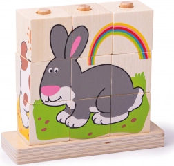 Deväť kociek poskladá štyri rôzne motívy zvieratiek, ktoré lákajú k opakovanému skladaniu a podporujú logické uvažovanie a vizuálne vnímanie.
