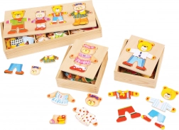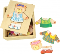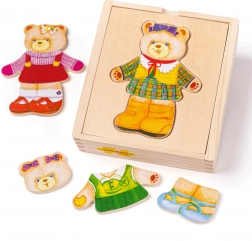 Roztomilé drevené obliekacie puzzle pre najmenších pomáha deťom kombinovať oblečenie a výrazy medvedice. Obsahuje 18 dielikov, praktickú krabičku s vekom–doštičkou a podporuje jemnú motoriku, koordináciu oko–ruka aj slovnú zásobu. Vyrobené z kvalitného dreva, bezpečné od 3 rokov a v súlade s európskymi bezpečnostnými normami.