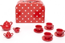Usporiadajte dokonalú detskú čajovú párty s týmto kúzelným setom v červenej farbe s bielymi bodkami. Súprava obsahuje všetko, čo malí hostitelia potrebujú – kanvicu, 4 šálky s podšálkami, cukorničku a džbánik na mlieko. Všetko sa po hraní ľahko uloží do pevného kufríka, takže je set ideálny aj na cesty. Vyrobené z kvalitných materiálov a v súlade s európskymi bezpečnostnými normami.