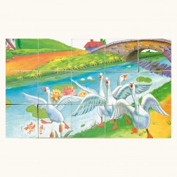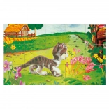 Deti zložia obrázky husí pri potoku, šteniatka na lúke či prasiatok pri chlieviku – pestré farby a milé ilustrácie podporujú fantáziu a spoznávanie zvierat.