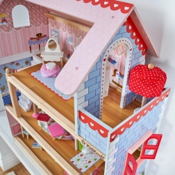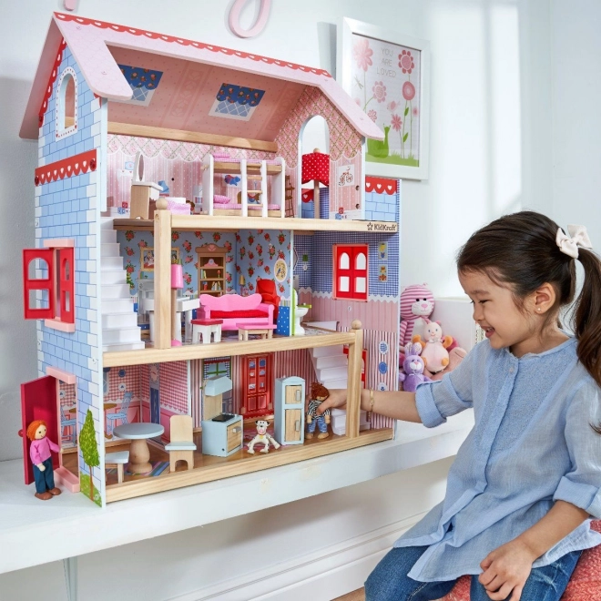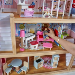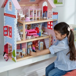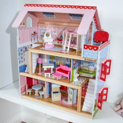 Domček pre bábiky KidKraft Chelsea poteší bohatými detailmi a premysleným vybavením. Tri poschodia s piatimi izbami a balkónom lákajú k otvorenej hre, zatiaľ čo farebné doplnky a realistické prvky podporujú rozvoj fantázie aj jemnej motoriky. Súčasťou je 16 kusov nábytku na okamžité hranie.