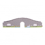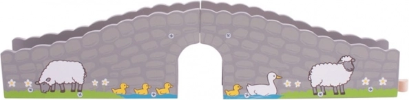 Navrhnutý v šedej farbe, pripomínajúci kamenný most s ilustráciou farmárskych zvieratiek pre autentický zážitok.