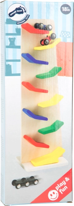 Drevená kaskádová veža small foot poteší malých fanúšikov áut. Po uvoľnení autíčka sviští po rampách nadol a vytvára zábavný „klap klap“ efekt pre oči aj uši. Rozvíja jemnú motoriku, je robustná a odolná a skvele sa hodí aj do materských škôl.