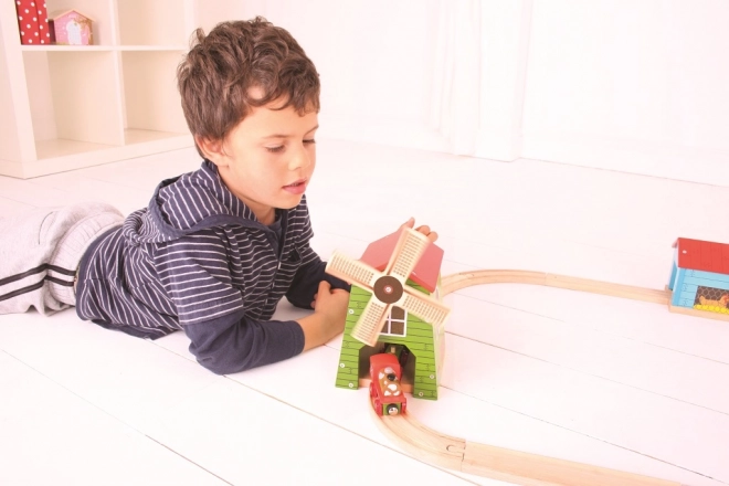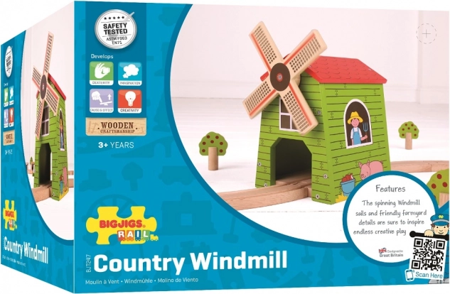 Rozšírte svoju drevenú vláčikodráhu o interaktívny veterný mlyn od Bigjigs Rail. Deti prechádzajú vlakom cez mlyn a otáčajú pohyblivými lopatkami, čím rozvíjajú predstavivosť, jemnú motoriku a koordináciu. Kompatibilný s väčšinou drevených vláčikodrág na trhu, vyrobený z kvalitného dreva a spĺňa európske bezpečnostné normy. Vlak ani ďalšie príslušenstvo nie sú súčasťou balenia.