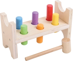 Zatláčanie farebných kolíkov kladivkom posilňuje úchop, presnosť a koordináciu ruka–oko – ideálne pre prvé motorické výzvy.