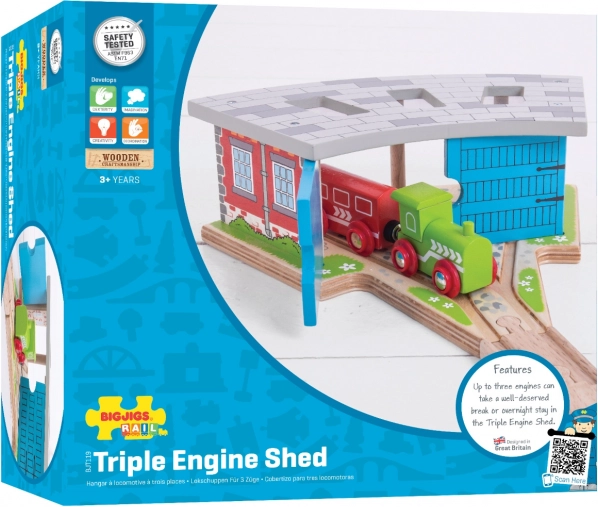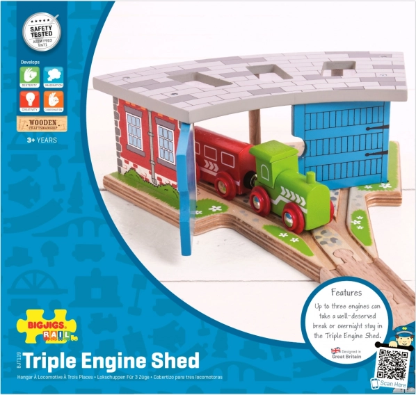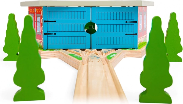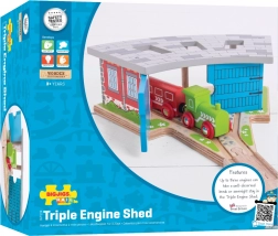 Trojité depo s dverami je ideálny doplnok pre každého malého rušňovodiča. Vďaka trom stánkom a integrovanému napojeniu koľajníc ľahko zorganizujete prevádzku na trati a uložíte vláčiky po dni plnom jazdenia. Pevná drevená konštrukcia s farebnými detailmi pôsobí realisticky a vydrží aj intenzívne hranie.
