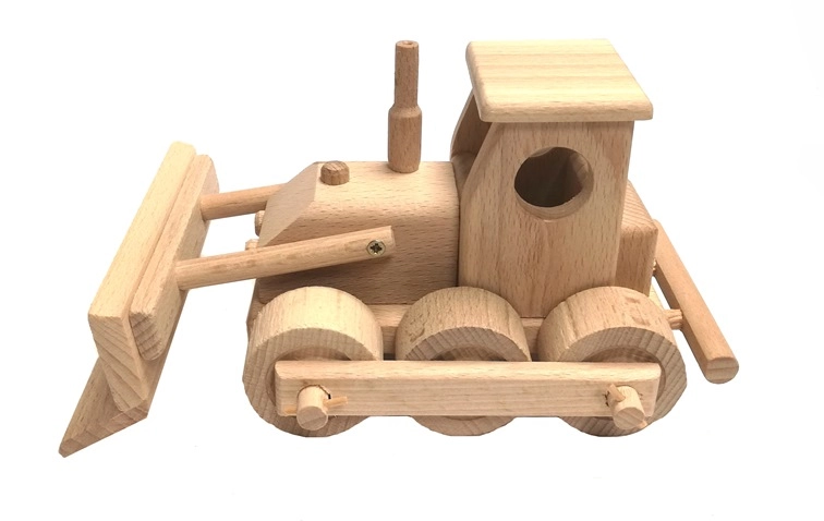 Buldozér ponúka realistickú hru vďaka pohyblivej prednej radlici a spoľahlivo sa otáčajúcim dreveným kolieskam.