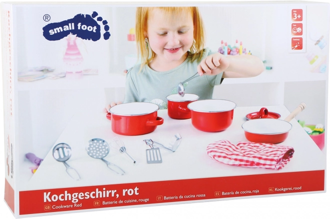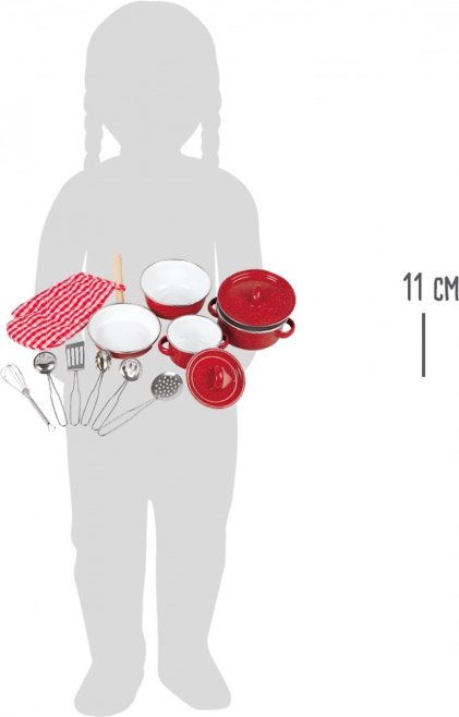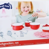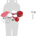 Táto nádherná červená sada kovového nádobí je perfektná pre všetkých malých kuchárov. Obsahuje rôzne kuchynské potreby, ako je hrniec, panvica, chňapka a ďalšie pomôcky, ktoré pomôžu deťom cítiť sa ako skutoční šéfkuchári. Je skvelá pre interaktívne hry a rozvíjanie kreatívneho myslenia.