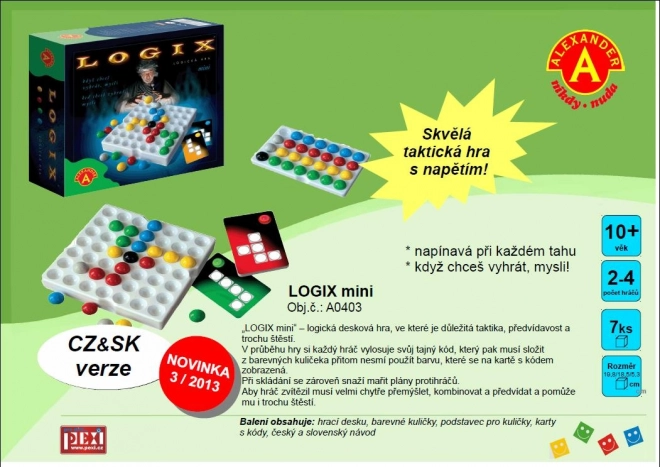 V ALEXANDER LOGIX Mini sa každý hráč snaží čo najrýchlejšie zostaviť svoj tajný kód podľa vylosovanej karty. Pridávaním, odoberaním a výmenou farebných guľôčok na priestorovej doske vytvárate vzory, ktoré vás priblížia k víťazstvu, a zároveň šikovne blokujete súperov. Rýchle kolá, jasné pravidlá a napätie až do posledného ťahu robia z LOGIX Mini výbornú voľbu na spoločné večery.