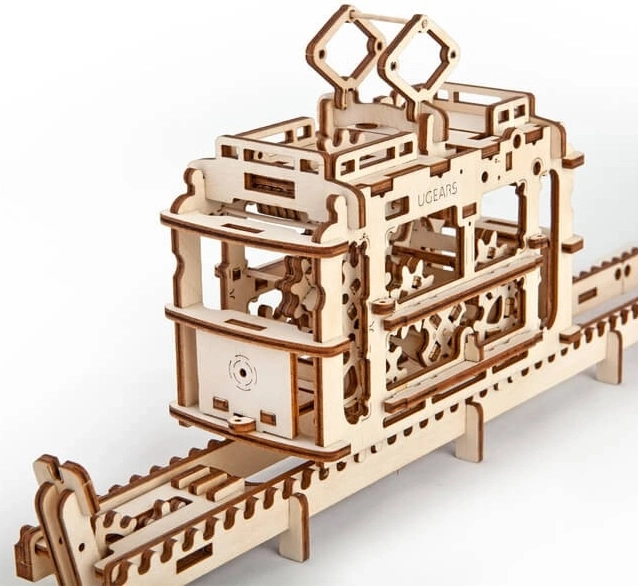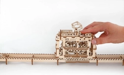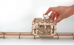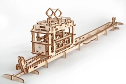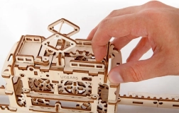Model je vybavený naťahovacím mechanizmom pre dopredný aj spätný chod, takže kabína zvládne aj jazdu do kopca. Praktický úložný priestor je ukrytý pod strešným únikovým okienkom. Stavebnica je vyrobená z kvalitnej dyhy, skladá sa bez lepidla a obsahuje detailný návod.