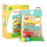 Drevený kaskádový domček VILAC nadchne malé deti svojou zábavnou jazdou guľôčok a pôvabným dizajnom. Ponúka 3 rampy na oboch stranách, po ktorých sa drevené guľôčky kotúľajú zhora nadol a pri dojazde do cieľa zazvoní kovový zvonček. Hračka v pastelových farbách rozvíja zručnosť aj logické myslenie a poskytne hodiny radostnej hry.