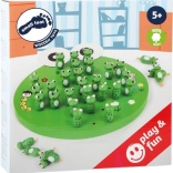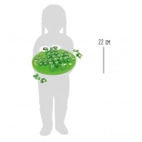 Farebná drevená doska v tvare žaby s kvetmi a chrobáčikmi motivuje k hre a podporuje predstavivosť. Vďaka prehľadnému rozloženiu otvorov sa deti ľahko zorientujú.