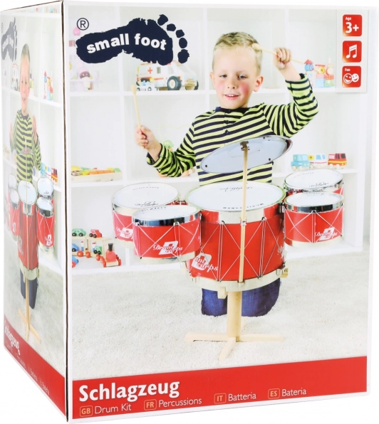 Rozbehnite domáce koncerty so štýlovou detskou bicíou súpravou SMALL FOOT v ohnivom červenom prevedení. Sada z kvalitného dreva a kovu obsahuje 5 bubnov, činél, stojan a 2 paličky. Robustná konštrukcia podporuje rozvoj rytmu, koordinácie a jemnej motoriky detí od 3 rokov.
