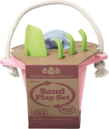 Green Toys ponúka zodpovedné hračky zo 100% recyklovaného plastu, ktoré neobsahujú PVC, bisfenol ani ftaláty. Táto ružová sada na piesok obsahuje: