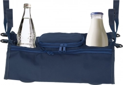 Praktický organizér na kočík s dvoma držiakmi na fľaše, priestranným vreckom na zips a menším vreckom na zips. Ľahko sa upevňuje pomocou pások na suchý zips a udrží všetky nevyhnutnosti poruke – od plienok a obrúskov po hračky, telefón a fľašu s mliekom či nápojom.