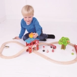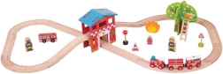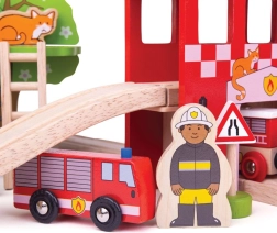 Táto drevená vláčikodráha s motívom hasičskej stanice premení každú izbu na záchranárske centrum. Deti môžu prechádzať tunelom hasičskej zbrojnice, pretekať sa s hasičským vozidlom, posielať záchranný vlak s odnímateľnými vozňami a pomáhať hasičom s rebríkom či hydrantom. Vďaka pestrým detailom a robustnému prevedeniu hračka skvele rozvíja predstavivosť a učí deti riešiť situácie.