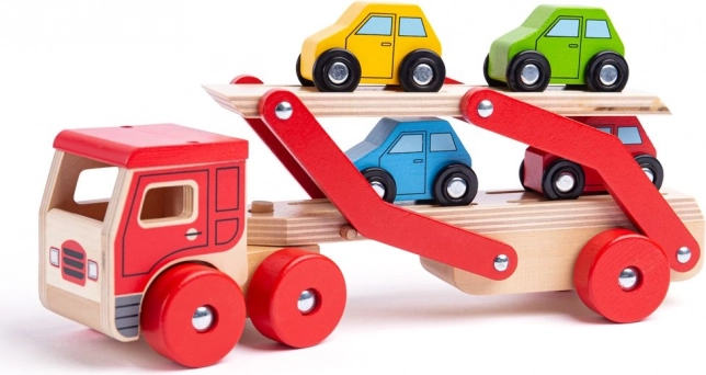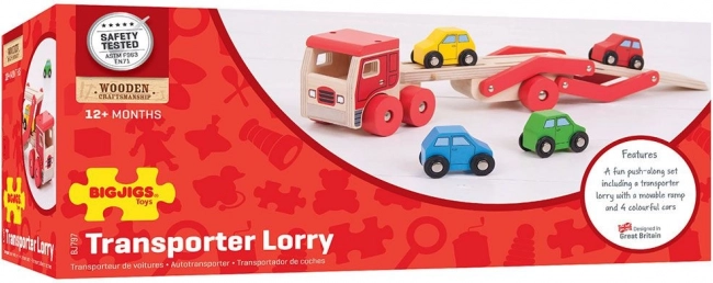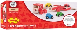 Bigjigs Toys prináša deťom nekonečnú zábavu s dreveným kamiónom s autami, ktorý poskytuje nielen hodiny hrania, ale tiež podporuje rozvoj koordinácie rúk a očí. Hornú časť návesu možno ľahko znížiť, čo umožňuje jednoduchý nájazd a zjazd malých vozidiel.