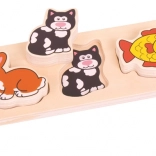 Drevené vkladacie puzzle BIGJIGS s motívmi psa, mačky, králika, rybičky a morčiat ponúkajú ideálnu prvú hlavolamovú hračku pre najmenších. Dieliky majú príjemný tvar a veľkosť pre malé ruky, takže sa ľahko zdvíhajú a vkladajú do správnych otvorov. Farebne potlačená základná doska navádza dieťa k úspešnému priraďovaniu a posilňuje radosť z učenia.