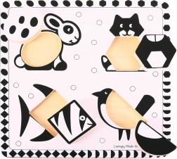 Objavte prvé puzzle pre najmenších – kvalitné drevené vkladacie puzzle v kontrastnom čiernobielom prevedení. Kontrastné farby deti ľahko vnímajú, takže hra skvele podporuje ich prvé vnemy. Veľké masívne dieliky sa deťom dobre uchopujú, rozvíjajú jemnú motoriku, zmyslové zručnosti a sústredenie. Vyrobené z zodpovedne získaného dreva, spĺňa európske bezpečnostné normy.