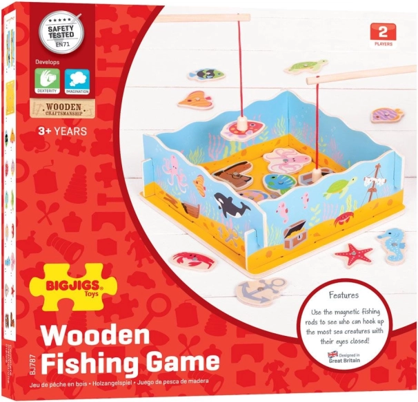 Deti pomocou magnetických prútov lovia 11 rybičiek a ďalšie kúsky, ako je truhlica s pokladom, topánka či kotva, a trénujú presnosť pri ich ukladaní na správne miesta. Kvalitné drevené spracovanie a bezpečné farby zaručujú dlhú životnosť a bezpečné hranie.