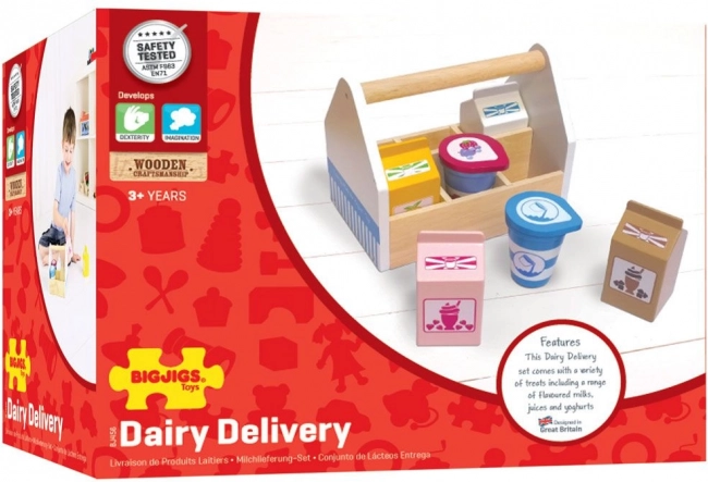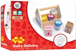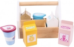 Táto robustná drevená prepravka ukrýva štyri kartóny nápojov (mlieko, pomarančový džús, jahodový a čokoládový koktejl) plus kelímok jogurtu a smotany. Ideálny doplnok do detskej kuchynky aj obchodu, ktorý deťom hravou formou približuje základy zdravej výživy a pôvod potravín.