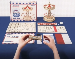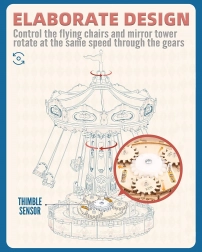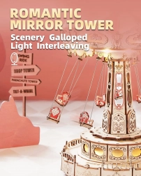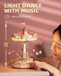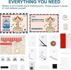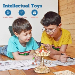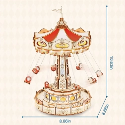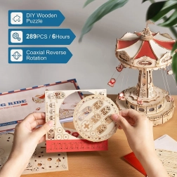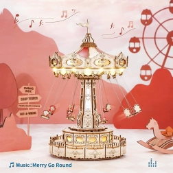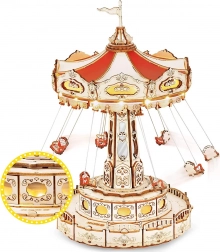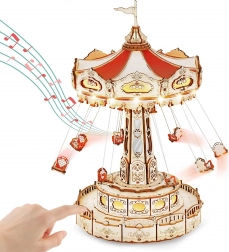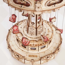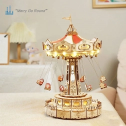 Táto 3D skladačka hracej skrinky predstavuje elegantný reťazový kolotoč s bohatou výzdobou v prírodných a farebných tónoch. Po zložení sa kolotoč roztočí vďaka motoru, rozžiari sa LED osvetlením a prehrá melódiu Merry Go Round, ktorá vykúzli nostalgickú, romantickú atmosféru. Sada je dodávaná v nerozloženom stave s podrobným návodom – ideálny projekt na víkendové tvorenie.